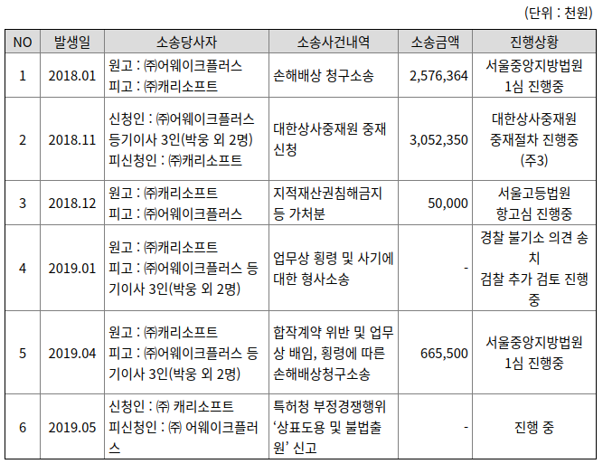현재 6건의 소송 및 분쟁에 계류 중이라고 나와 있습니다. 그 중 소속 금액이 큰 1, 2번이 캐리소프트가 피소된 사건입니다. 두 사건의 소속 금액을 합치면 56억이 넘습니다. 캐리소프트 2018년 매출이 99.6억, 당기순이익이 -21.8억입니다. 소송금액이 매출과 이익 규모에 봤을 때 상당합니다. 이런 위험으로 이번 공모 시 소송으로 인한 피해 금액이 발생할 경우 대표이사가 손해에 대한 금원을 보전하는 확약을 했다고 쓰여있습니다. 시장 거래 가격 기준으로 산정한 수량의 주식을 무상으로 캐리소프트로 이전하는 방식입니다. 하지만 소송 당사자는 캐리소프트이기 때문에 재무제표에 영향을 주며 행여 대표이사가 도망가거나 파산 신청을 하는 등 확약을 이행하지 않으면 문제는 심각해집니다.