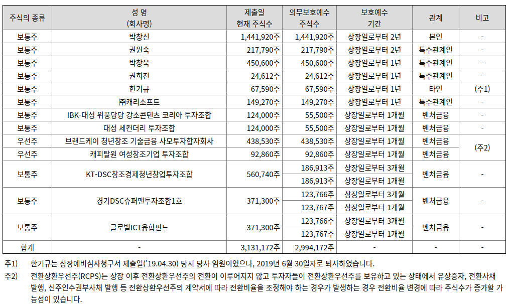 상장 후 실제 사업에 들어가는 돈이 생각보다 적습니다. 운영과 시설에 들어가는 자금 계획이 개인적으론 좀 회의적입니다. 대신 캐리소프트 대표이사를 비롯한 가족이 가진 약 39%의 지분은 공모가 9,000원으로 계산했을 때 약 190억 정도 됩니다. 상장 후 1년 동안은 가족들이 지분을 팔지 못하도록 1년의 보호예수가 걸려있습니다.
