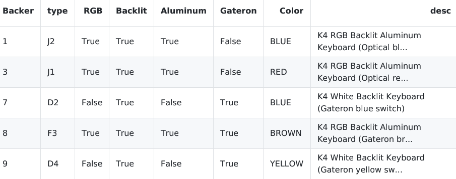 얼마 전 키크론(Keychron) K4 키보드가 킥스타터를 통해 펀딩을 진행했었습니다. 그리고 발송 관련 이메일이 왔는데 펀딩에 참여한 사람들의 키보드 옵션이 함께 포함된 엑셀 시트가 포함되어 있었습니다. 킥스타터 펀딩 참여 당시 어떤 스위치(게이트론, LK광축)와 축(적축, 청축, 갈축, 황축)를 선택할지 고민이 되었었는데요. 실제로 사람들은 어떤 키보드를 많이 주문했을까요? 판다스로 간단히 분석해보기로 했습니다. 여기에 언급된 순위는 키크론 사에서 펀딩 참여자에게 발송한 2019년 11월 경의 이메일 첨부 엑셀을 기반으로 한 것이니 모집단에 한계가 있는 점 참고해주세요.