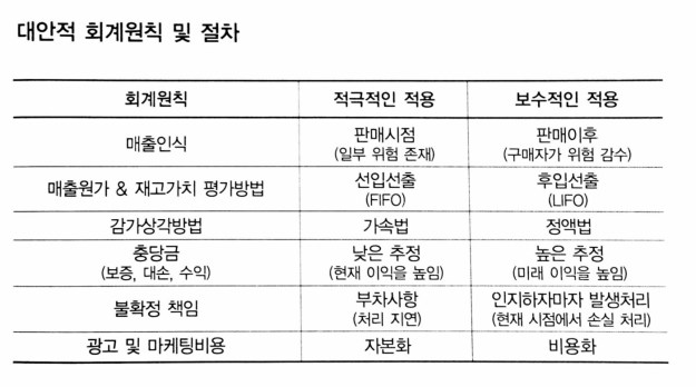 어떤 기업이 보수적인 회계원칙에서 덜 보수적인 회계원칙으로 바꿔 적용하는 등의 회계 관리상의 변화가 있다는 것은 부정적 신호일 수도 있다. (회계조작 같은..) 재고가치평가를 하는 데 있어 LIFO대신 FIFO를 사용하기 시작하거나, 마케팅 비용을 비용 대신 자본으로 처리하거나, 매출인식과 관련된 원칙을 완화하거나, 감가상각 일정을 지연하거나 하는 등의 변화다. 이런 변화는 경고신호고 대부분 합당한 이유 없이 일어나기 때문에 주의를 기울여야 한다.