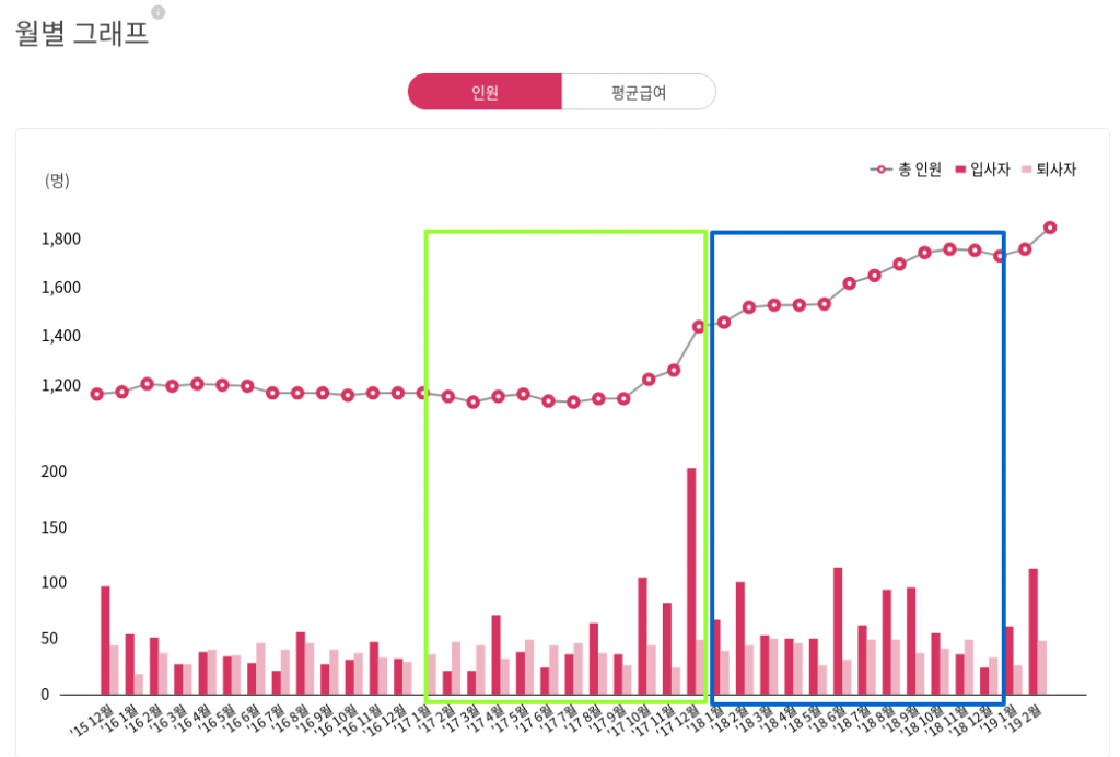 - 아래 급여와 퇴직급여가 크게 늘었는데 크레딧잡에서 총인원을 살펴보니 해당 시기에 많은 인력충원이 있었음을 알 수 있다. (초록색 네모는 2017년, 파란색 네모는 2018년)