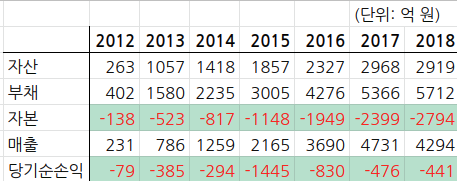 매출은 2018에 처음으로 꺾였고 당기순손익은 계속 손실이다. 부채는 계속 늘어나고 있고 자본도 계속 마이너스 증가하고 있다. 전자공시에 올라온 2018(제 9기) 재무제표다. 대체로 좋지 않지만 몇 가지 눈에 띄는 것은 –